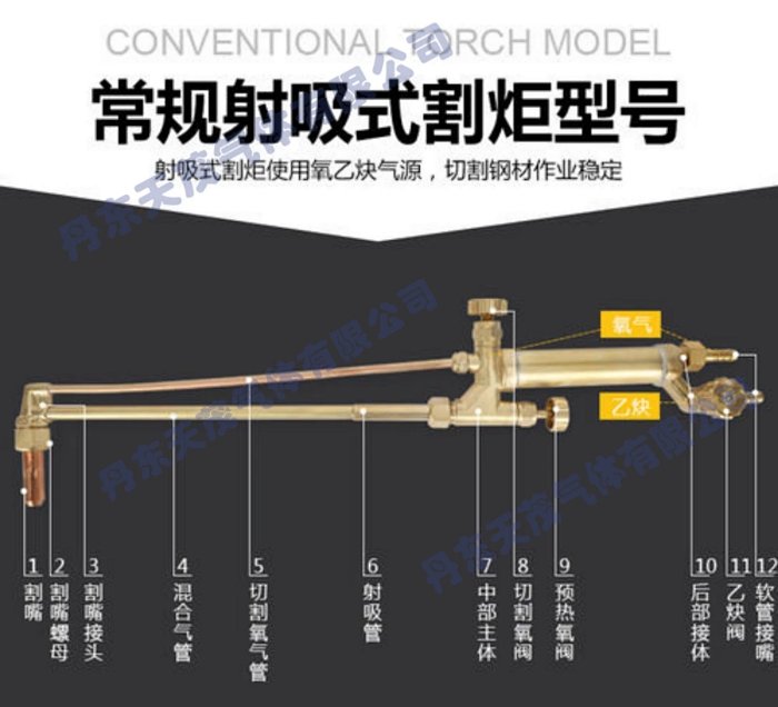 配备几种不同孔径的割嘴以切割不同厚度的金属。割嘴号码有1#、2#、3#,号码越大切割的金属越厚。